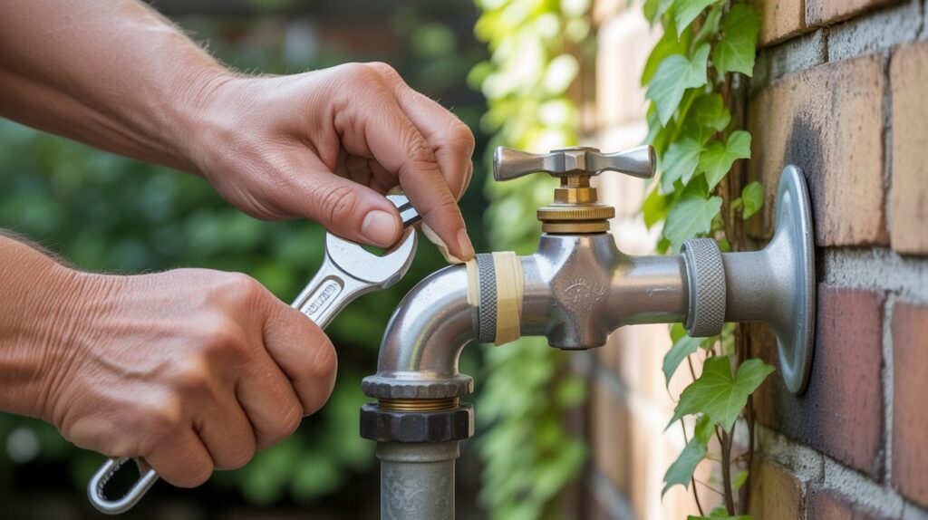 Screw the outdoor faucet (spigot or frost-proof type) onto the exposed pipe. Tighten it with a wrench, but don’t over-tighten — it could damage the threads. Apply pipe sealant or plumber’s putty to prevent leaks.